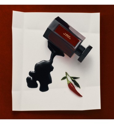 La composizione si muove in un territorio legnoso-ambrato, profondo e magnetico. Al centro emerge un inedito e affascinante accordo di inchiostro, scuro e sensuale, che evoca parole scritte nella notte e segreti mai pronunciati. Le foglie di peperoncino aggiungono una vibrazione piccante, calda e pulsante, come pelle che si accende al contatto.
